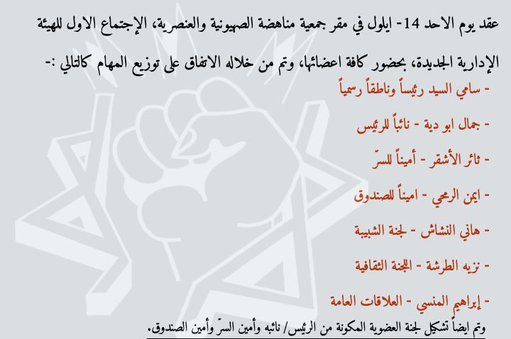 عقد يوم الاحد 14- ايلول في مقر جمعية مناهضة الصهيونية والعنصرية، الإجتماع الأول للهيئة الإدارية الجديدة بحضور كافة اعضائها، وتم من...
